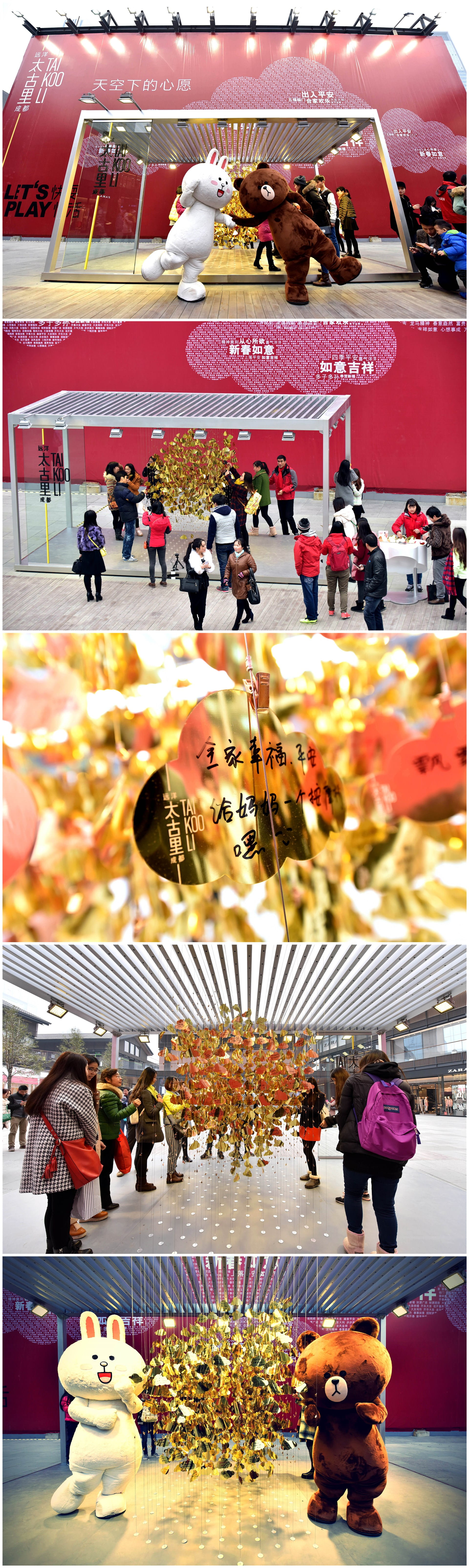 2月6-8日,请带着你的那一份美好心愿,来到成都远洋太古里东广场,在精美的卡片郑重写下心愿,添加到神秘装置上,见证2015份心愿汇聚在一起,闪耀一片天空!在心愿卡片上留下你的姓名与联络方式,还能在2015年每一个月,有机会获得一份惊喜礼物,甜蜜一整年。